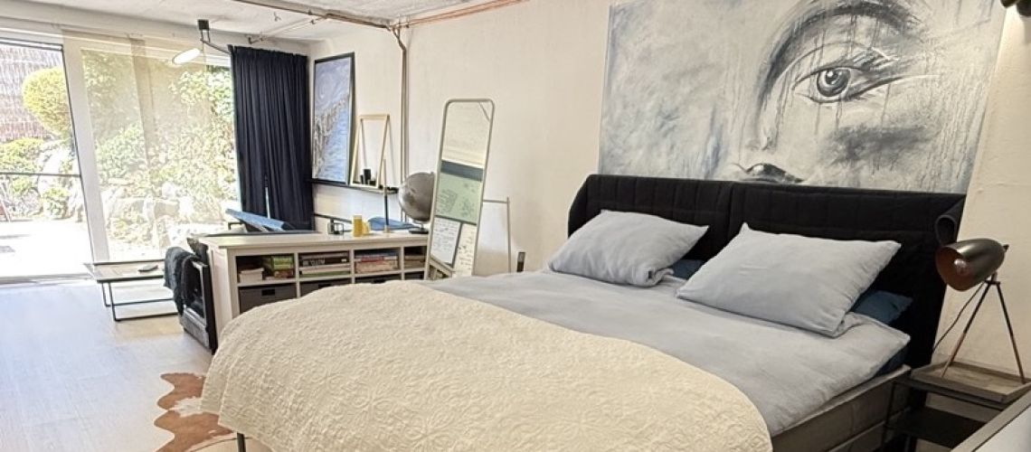 25qm im industrial Style Superbequemes Doppelbett Wohnbereich, Sofa FullHD Smart TVMehr...
